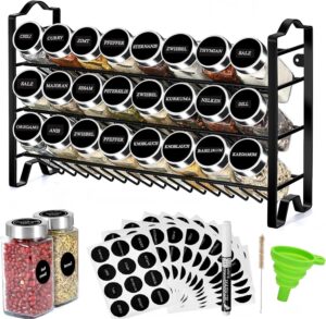 Al colocarlo en la encimera, nuestra primera impresión fue de orden inmediato y estabilidad. Llegó totalmente montado, con una estructura metálica de tres alturas que no se tambalea y con adhesivos antideslizantes para la base. Los 24 frascos de vidrio dan un aspecto uniforme y decorativo, y los dosificadores individuales permiten espolvorear sin derrames. La rotulación es sencilla: incluye 125 etiquetas ya impresas (en inglés) y 55 en blanco, más un rotulador tipo tiza; en nuestra prueba, pudimos borrar lo escrito con un paño húmedo para reetiquetar sin estropear la pegatina. El conjunto se siente compacto y estrecho, ideal para cocinas con poco fondo, y la opción de anclarlo a pared amplía las posibilidades de colocación.