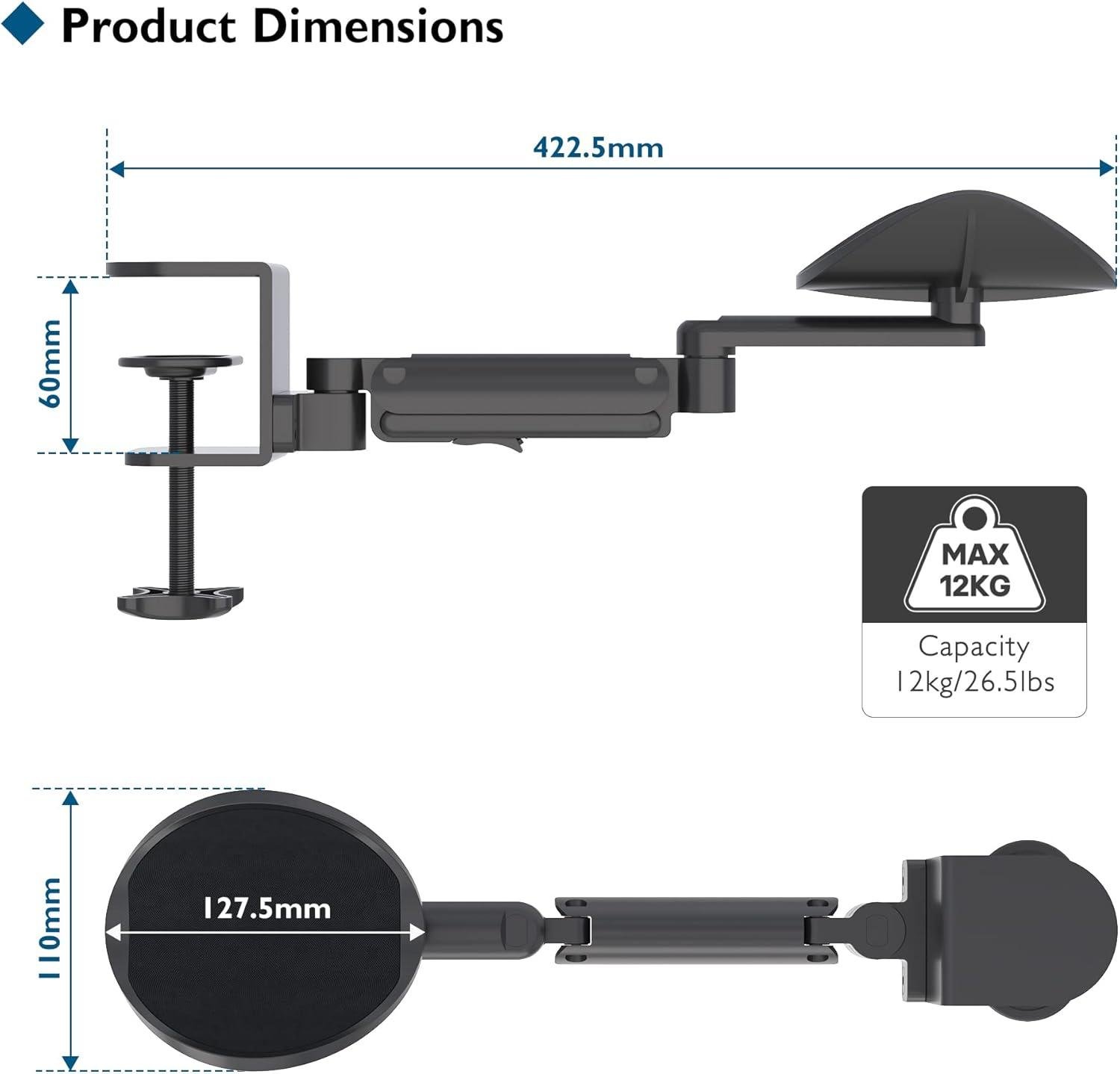 Al evaluar el confort que ofrece, encontramos que este soporte para el brazo destaca por su diseño ergonómico. Con una capacidad de rotación de 360 grados y un soporte que se extiende hasta 342 mm, nos permite ajustar el ángulo de descanso de una manera que se adapta perfectamente a nuestras necesidades. Además, al elevarse 72 mm sobre la superficie del escritorio, proporciona un alivio significativo a la presión en los codos, lo que resulta en menos molestias al trabajar durante largas horas.